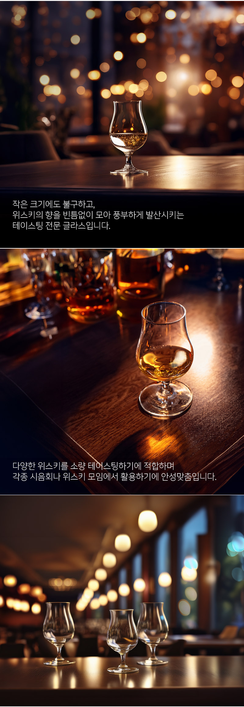 다양한 위스키를 소량으로 빠르게 비교하는 테이스팅에 적합한 사이즈와 디자인깨끗하고 투명한 크리스탈 글라스