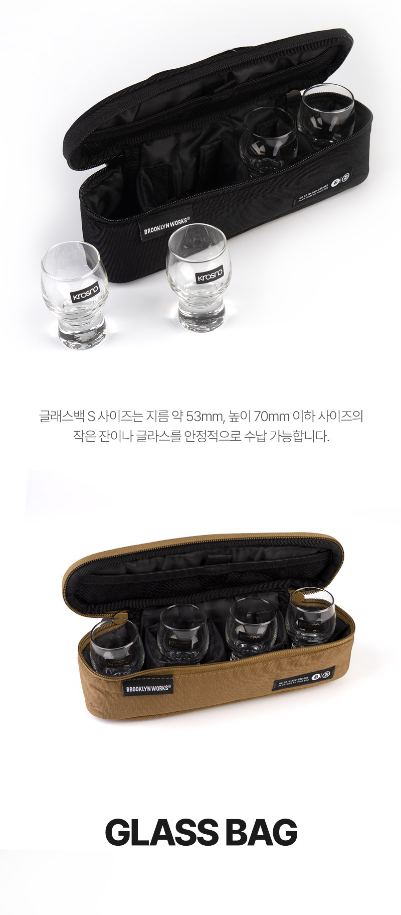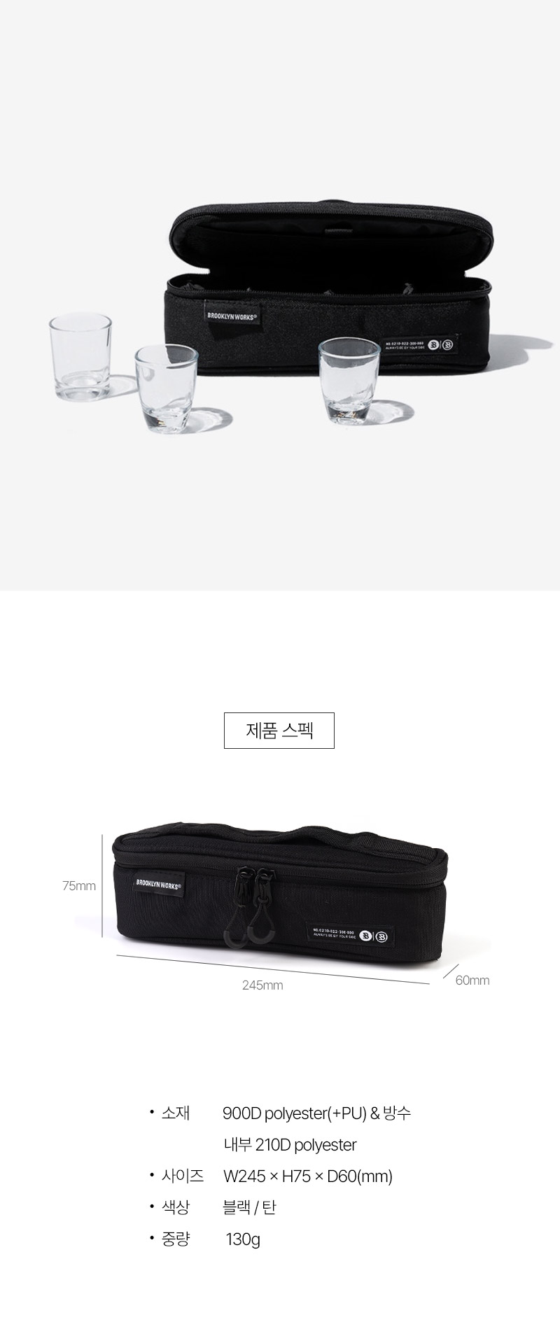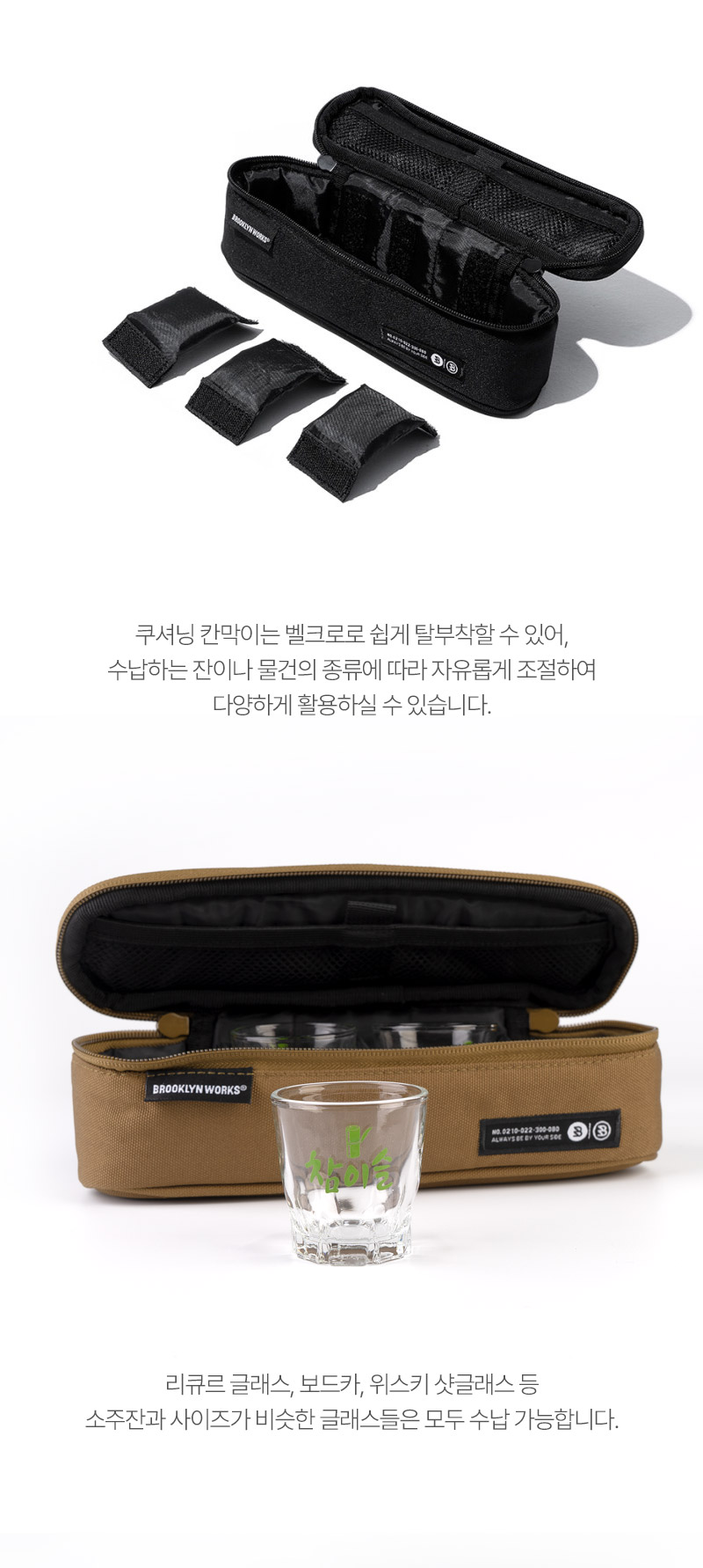 벨크로로 탈부착 가능한 쿠셔닝 칸막이가 있어 소주잔이나 위스키 샷글래스 4잔을 수납할 수 있으며, 방수 소재로 제작되어 실용성과 내구성을 모두 갖춘 캠핑용 트래블케이스