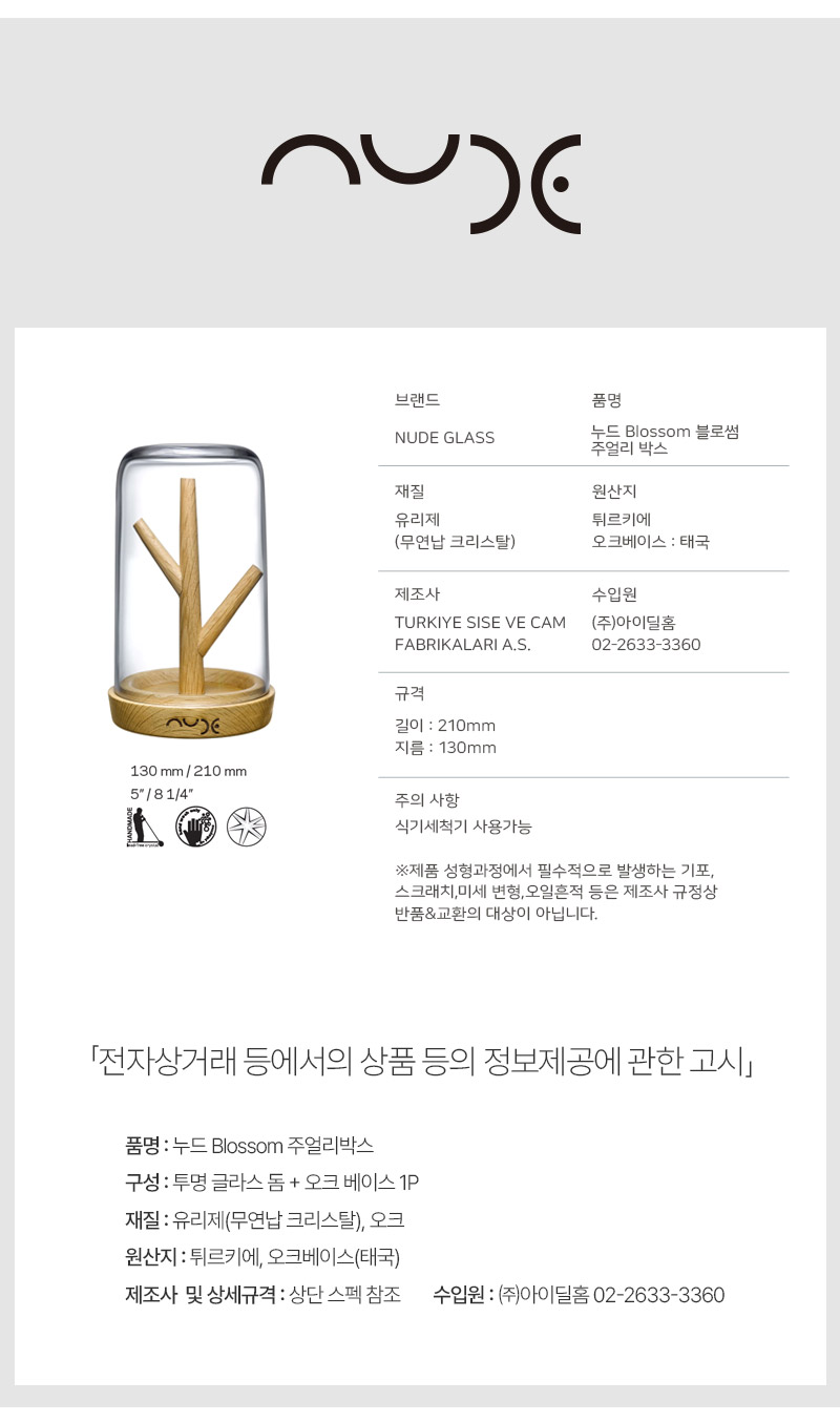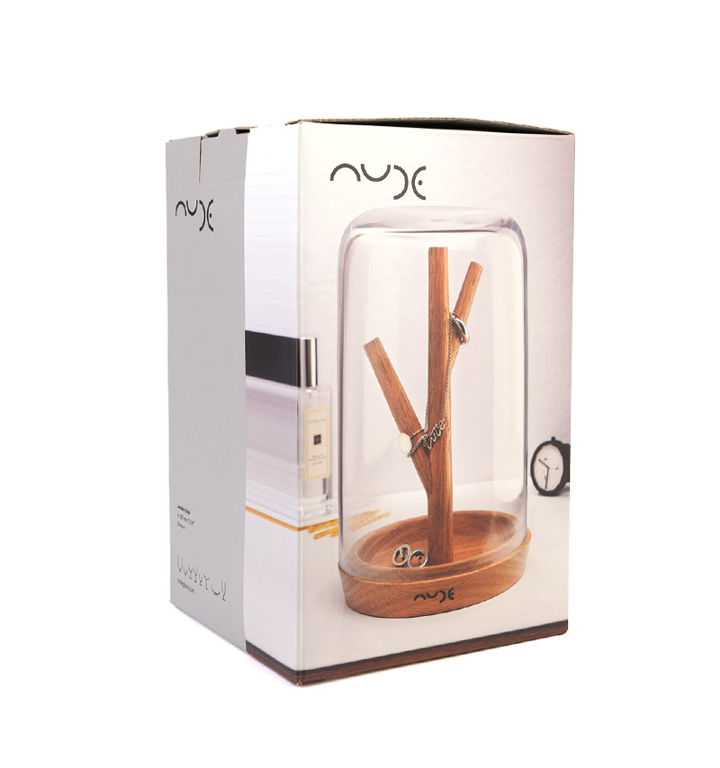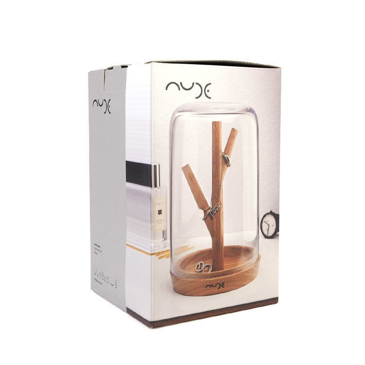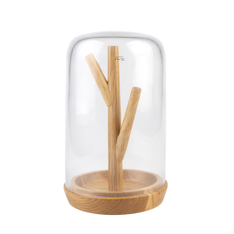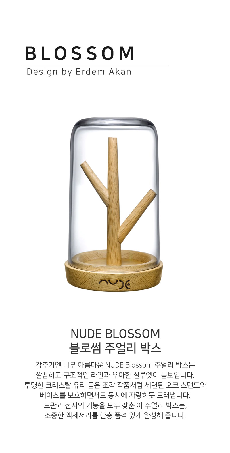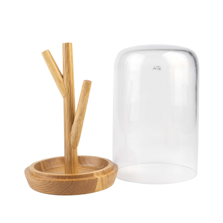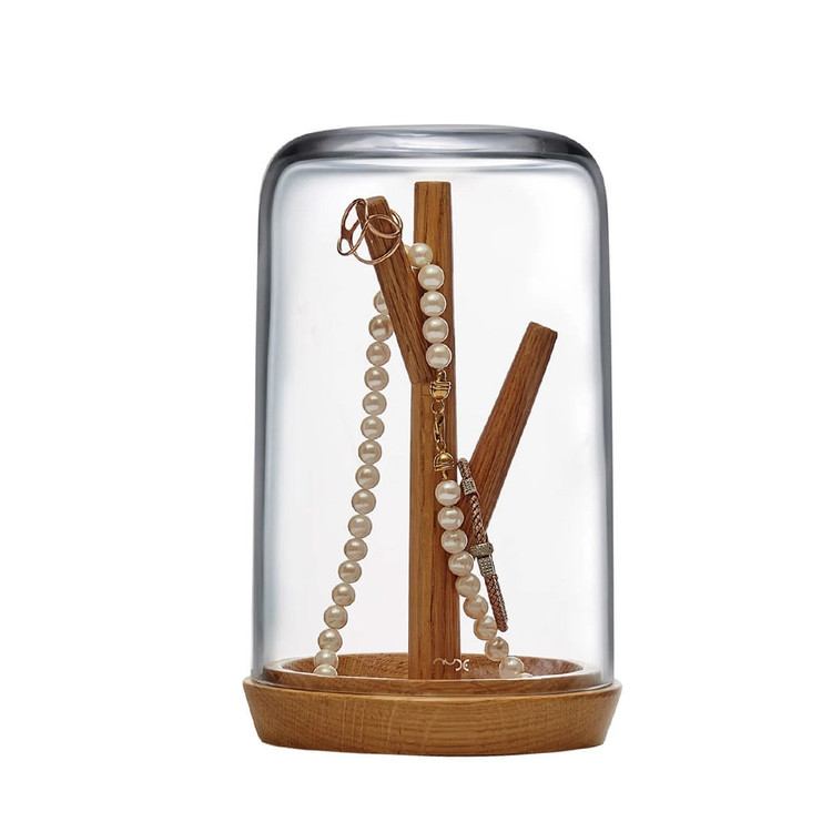투명한 크리스탈 돔과 오크 스탠드가 어우러진 누드 블로썸 주얼리 박스는