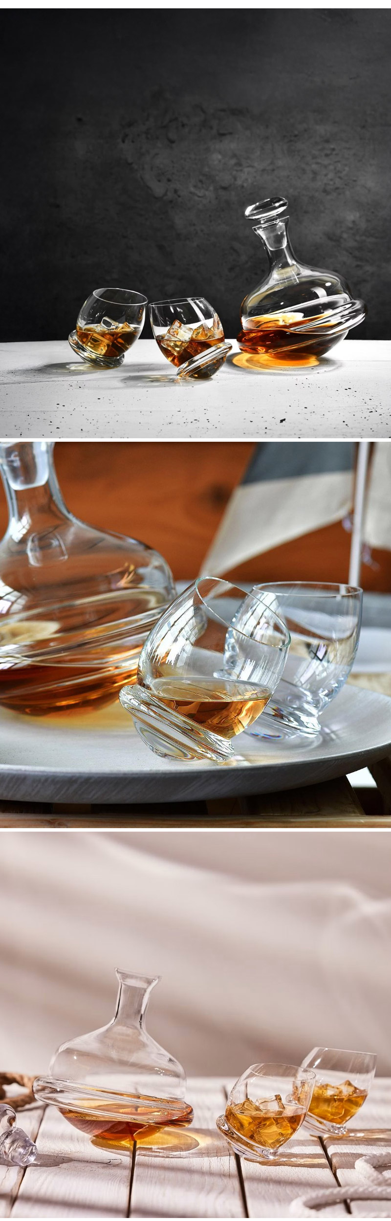 디켄터와 글래스 모두 마치 파도 위를 항해하는 듯 유연하게 흔들리지만 안정적으로 균형을 잡습니다.