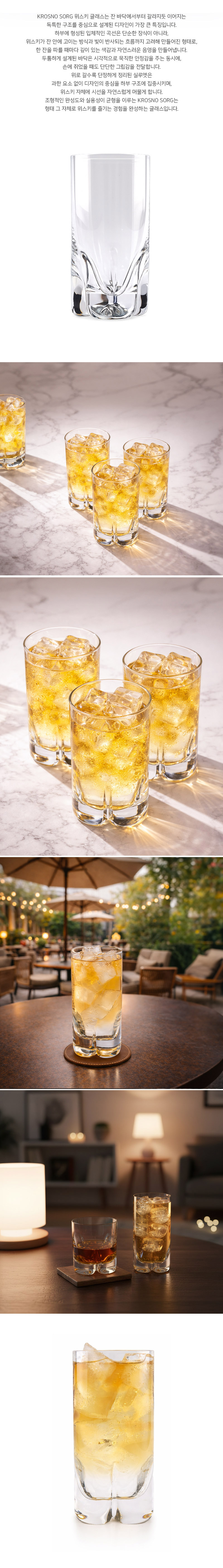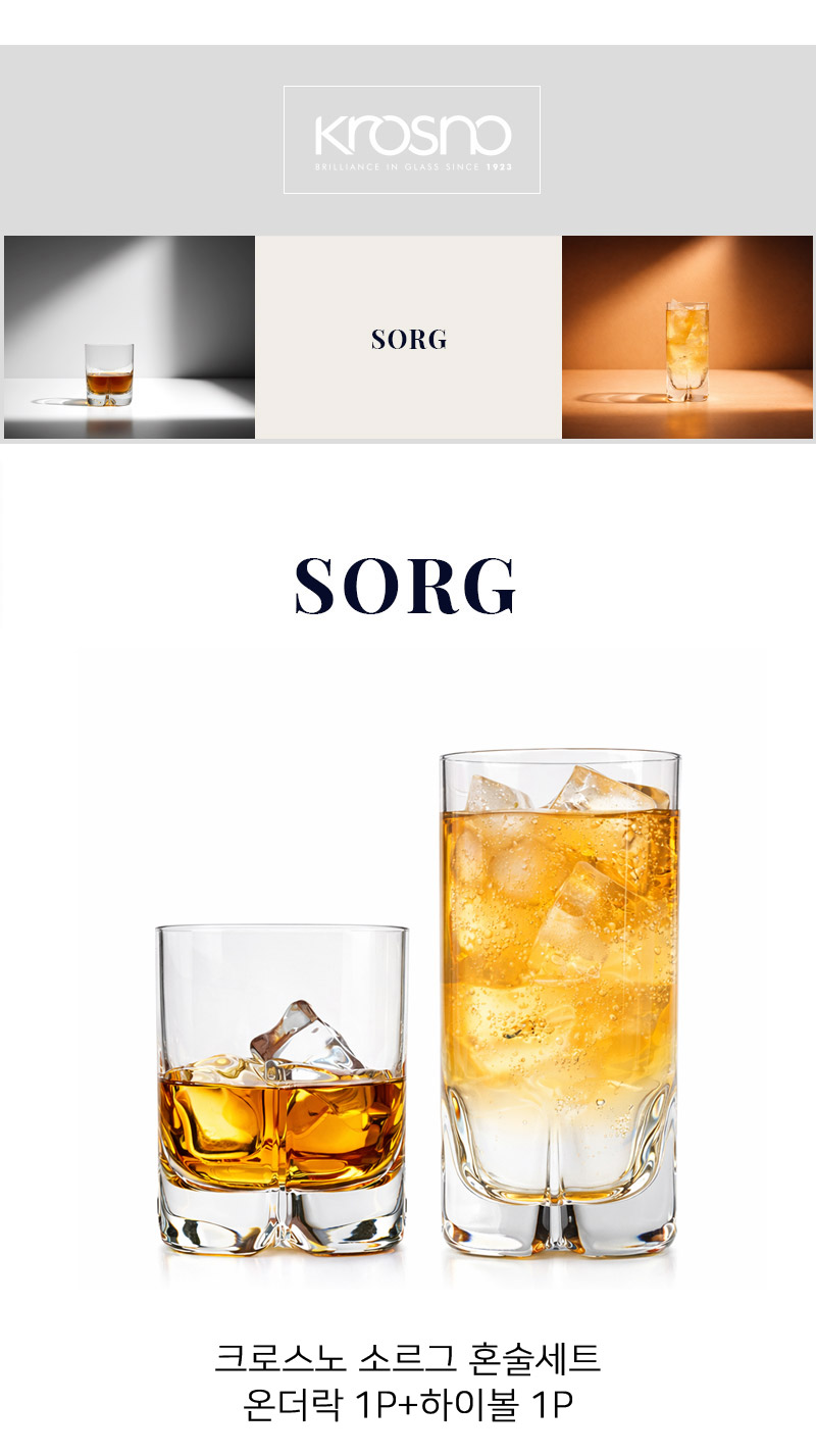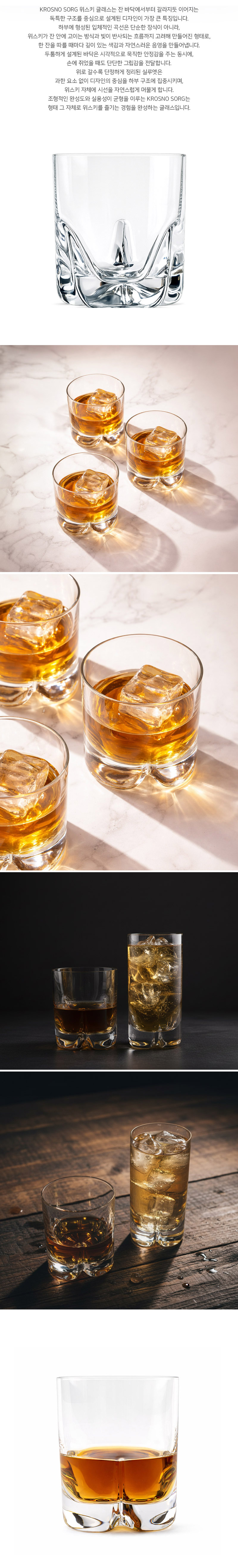 크로스노 소르그(SORG) 글래스는 독특한 바닥 구조와 안정적인 비율이 돋보이는 디자인으로, 위스키 온더락부터 하이볼까지 폭넓게 활용할 수 있는 글래스입니다. 잔 하부에서 자연스럽게 갈라지는 구조는 시각적인 포인트를 더하는 동시에 테이블 위에서 안정감을 높여주며, 위스키의 색감과 투명한 질감을 또렷하게 표현해줍니다. 과하지 않은 디자인과 균형 잡힌 형태로 홈바, 선물용, 데일리 유리잔으로 모두 잘 어울리는 크로스노 소르그 위스키 글래스입니다.